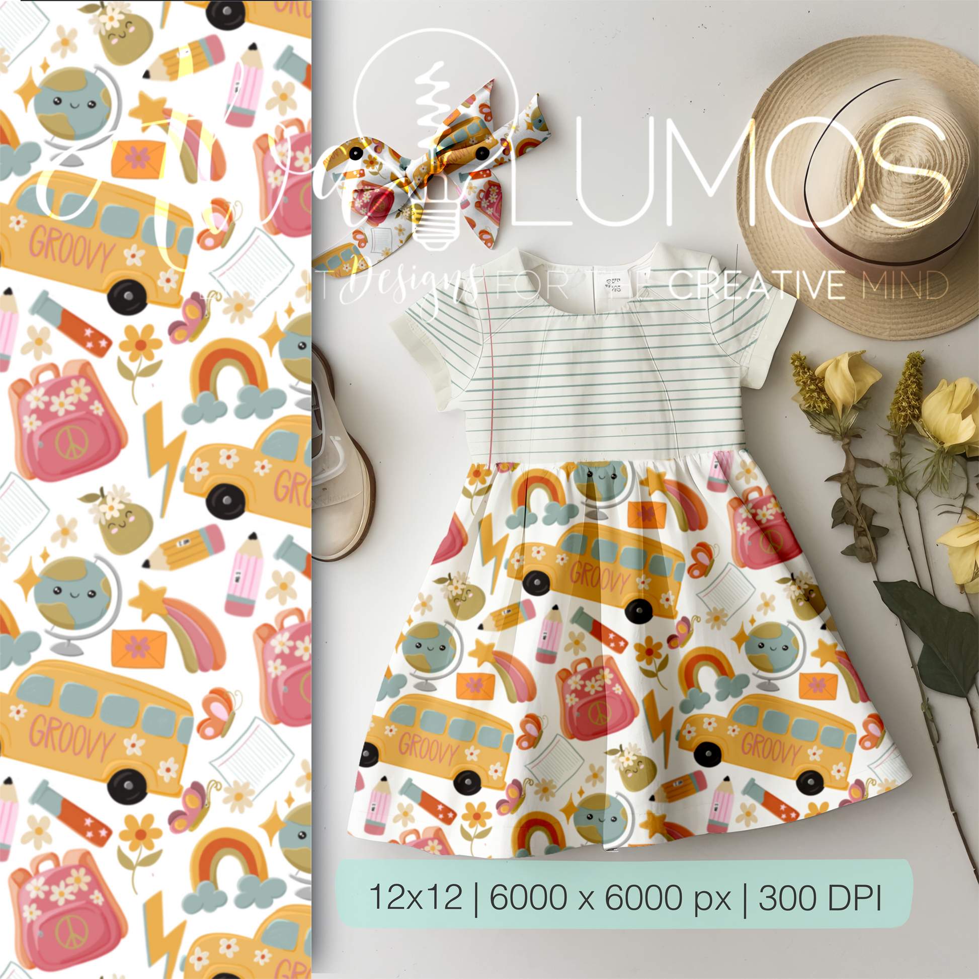 Capture the excitement of the first day of school with our charming seamless pattern. Featuring cute, groovy illustrations that evoke nostalgia and joy, this design is perfect for stationery, apparel, and decor. Transform your projects with this delightful pattern today. Perfect for small businesses, our digital files come with personal rights, allowing you to use these patterns across a range of applications: